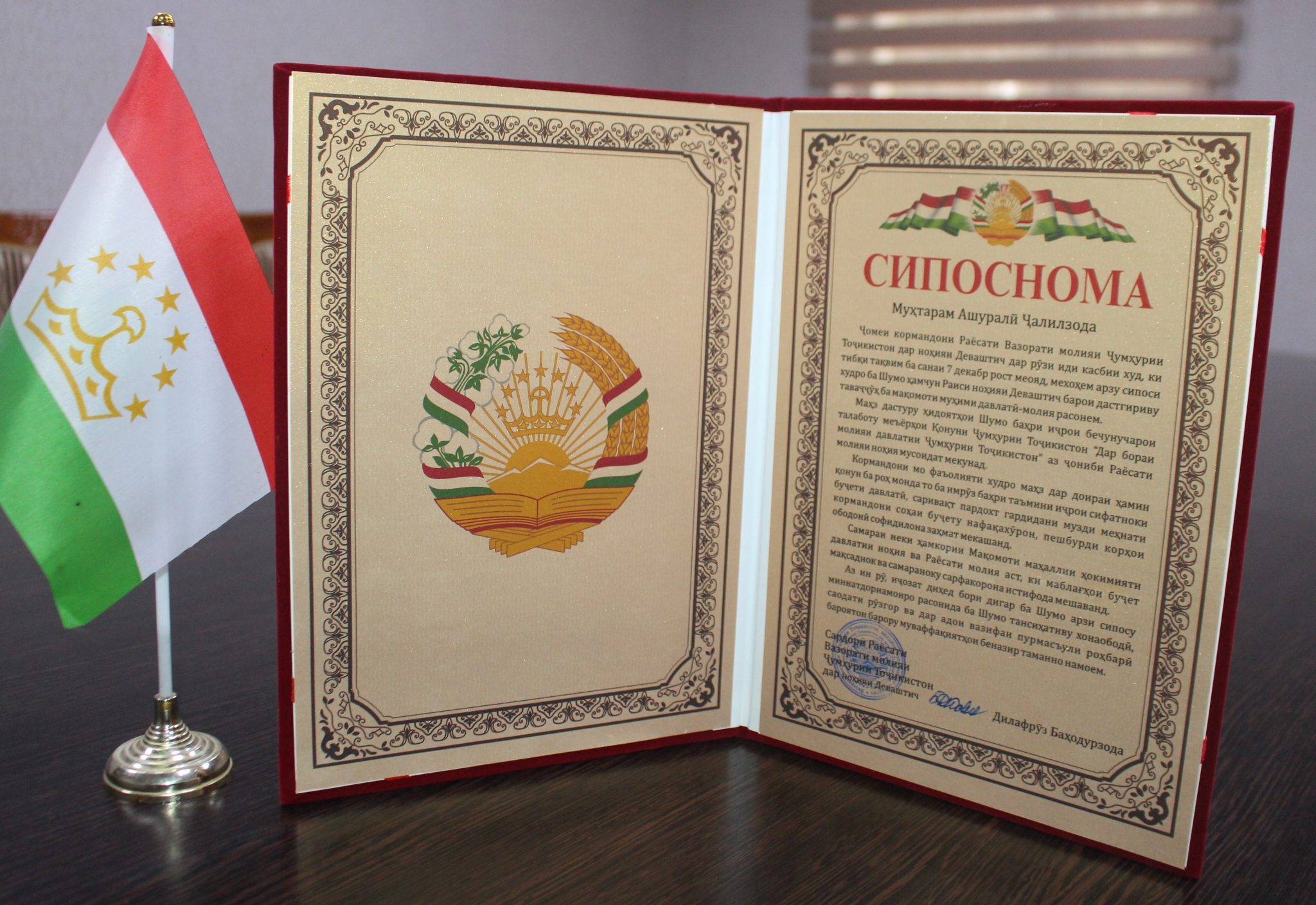 Сипас ба якчанд нафар кормандони Раёсати Вазорати молияи Ҷумҳурии Тоҷикистон дар ноҳияи Деваштич бо Сипоснома ва туҳфаҳои хотиравии мақомоти иҷроияи ҳокимияти давлатии ноҳия тақдим карда шуд.